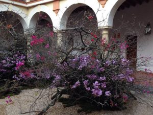 En la tercera visita se desplazaron hasta el patio de la sede de Vimcorsa, para contemplar la composición «Paraíso: delirio y deseo» de Tomas de Bruyne, que nos invita a experimentar un paraíso inspirado en la filigrana cordobesa. ¿Qué mejor explicación de su obra que sus propias palabras?: «Con mi admiración y respeto hacia las tradiciones de Córdoba y a esta extraordinaria ciudad, unidos al deseo de perpetuar y mantener viva la herencia de los patios». Como gran autor que es fusiona en su obra la espectacularidad y la delicadeza. Parte de una estructura formada por árboles artificiales imitando plata, de la que salen raíces creadas con flores moradas.