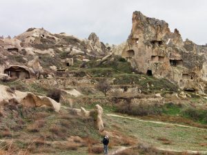 Así que nuestra estancia en The Traveller’s Cave Pension, la Cueva de los Viajeros (nunca mejor dicho), fue el sitio perfecto y genial estos días para nosotros, desde el que descubrir este rinconcito de Capadocia: el propio Gorëme, el cercano y nevado Uchisar con su castillo encaramado en la roca, pueblos como Cavusin y Zelve, y también cercanos valles de evocadores nombres; algunos de los cuales hemos podido caminar: valle Rosa , valle de la Paloma, valle de la Miel, valle del Amor….