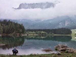 Lago Fusine con el Mangart entre neblinas. ¡A un paso de Eslovenia!