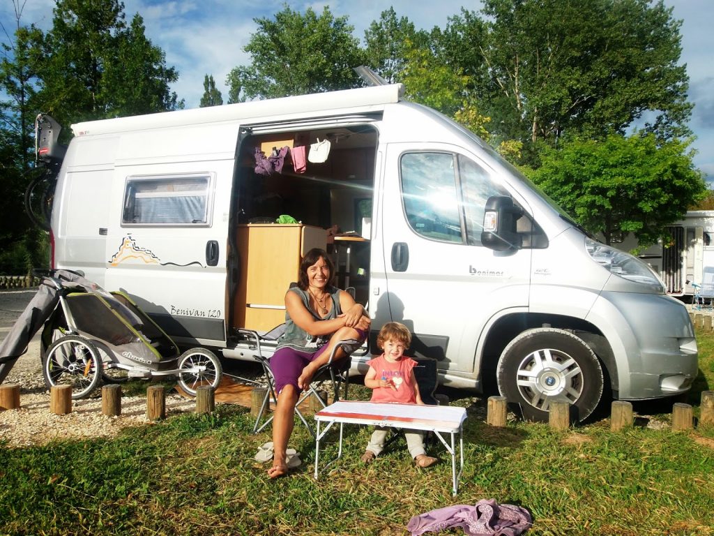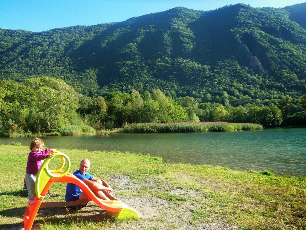 El sitio es perfecto para Noa (y para nosotros): mucho espacio, agua, rodeado de montañas…Como ya está septiembre a la vuelta de la esquina, esto está de lo más tranquilo…se está muy a gusto y decidimos quedarnos un par de días. Cerca teníamos una familia alemana con un hijo muy gracioso, Ben. Enseguida entablamos conversación y casualmente teníamos varias cosas en común, andaban también con bicis y un remolque Chariot como el nuestro, ella era también profe…echamos unas cuantas charladas, y nos reímos con los tejemanejes que se traen Ben y Noa. ¡Son agradables estos pequeños encuentros en el camino!.
