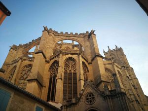 Atravieso el pueblo de Agde hasta llegar a Beziers por la orilla del canal du Midi navegable por barcos, durante media hora descanso ya que la etapa de hoy está siendo fácil y sin sorpresas yendo bastante bien de tiempo. Retomo el camino ya sin paradas hasta Narbona donde me impresiona la belleza de su catedral y edificios. Me cuesta poco encontrar el hostel ya que está enfrente de la catedral y parece demasiado nuevo para ser cierto, pero sí. ¡increíble, hostel con habitación privada!