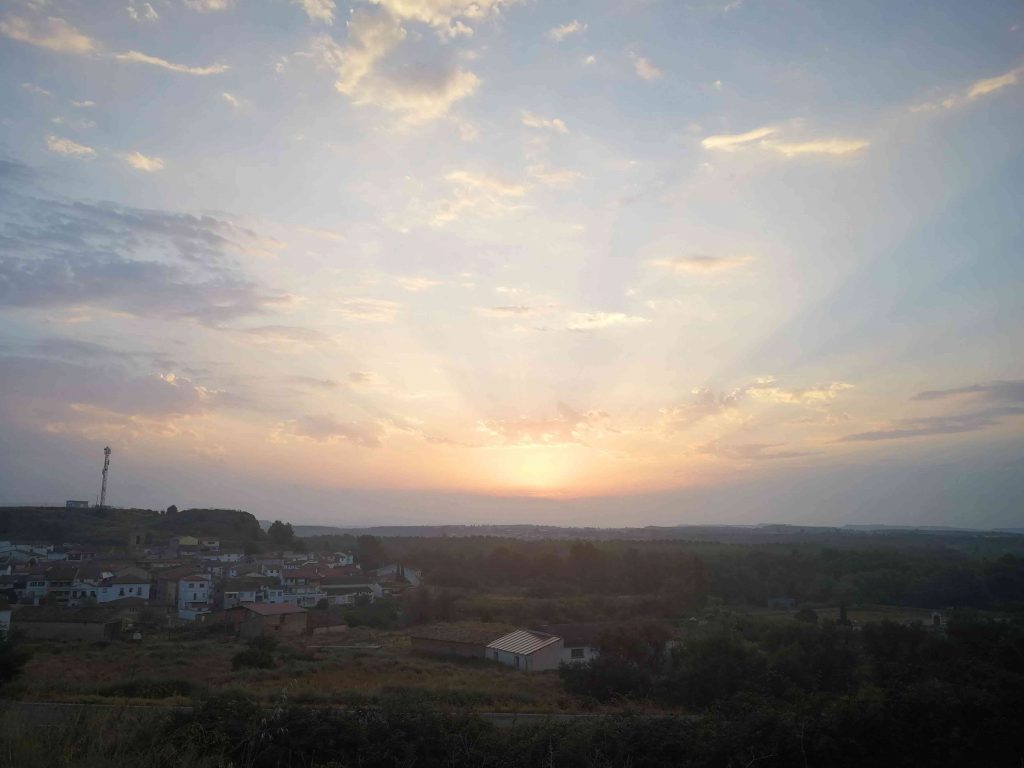 Suena la alarma muy temprano, desayuno en el hostal y aún con la luz de las farolas salgo del pueblo. Llevando 10 kilómetros se empiezan a ver los primeros rayos del sol del que me acompañará en esta larga y llana etapa que atravesare de punta a punta el desierto de Monegros.