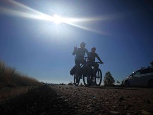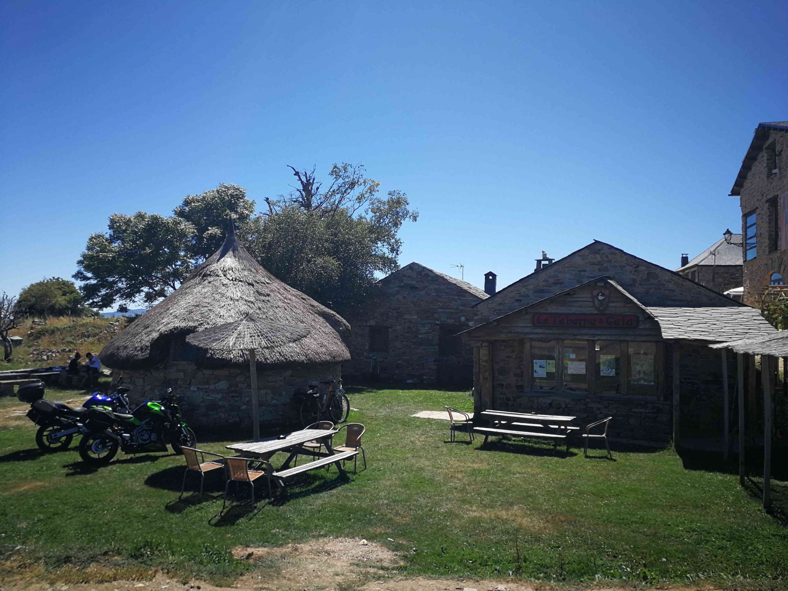 En marcha de nuevo y con el sol calentando vamos avanzando más lentamente, a unos 20 kilómetros nos damos cuenta que la rueda de Ariadna se está quedando sin aire así que paramos y reparamos el pinchazo en un momento y continuamos aunque cada vez nos va costando más pedalear al aumento de desnivel subiendo la Cruz de Ferro, antes de llegar paramos a mitad en Foncebadon para comer y seguir la segunda mitad del Puerto.