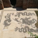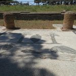 Es un sitio maravilloso porque tiene varias aristas que paso a detallar… pero primero un poco de sus orígenes. Ostia Antica surgió como una ciudad fortificada para el control del acceso fluvial a Roma. En el siglo I a.C. se extendió el perímetro de la ciudad a un circuito de muros que comprendían torres y tres accesos: la puerta Romana, la Marina y la Laurentina. Caminando por la vía Ostiense se entra a la Necrópoli atravesando la puerta Romana y comienza el recorrido por la vía principal el Decumano Massimo que en su época tenía 9 metros de ancho por casi 2 km de largo y en la que se puede visualizar el pavimento con la típica piedra volcánica. La ciudad tuvo un largo período de prosperidad (s. I a III d.C) seguido de una recesión y el abandono definitivo entre los siglos IX y X de la era cristiana. Las primeras excavaciones científicas se realizaron en el s. XIX (período de los papas Pio VII y Pio IX), pero la mayor riqueza arqueológica fue encontrada en la primera mitad del siglo XX. Actualmente se puede recorrer y disfrutar 2/3 de la superficie de la ciudad original.