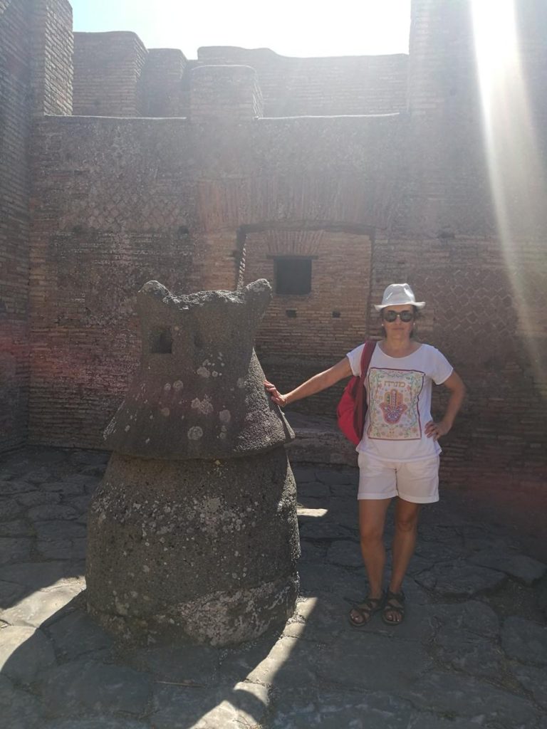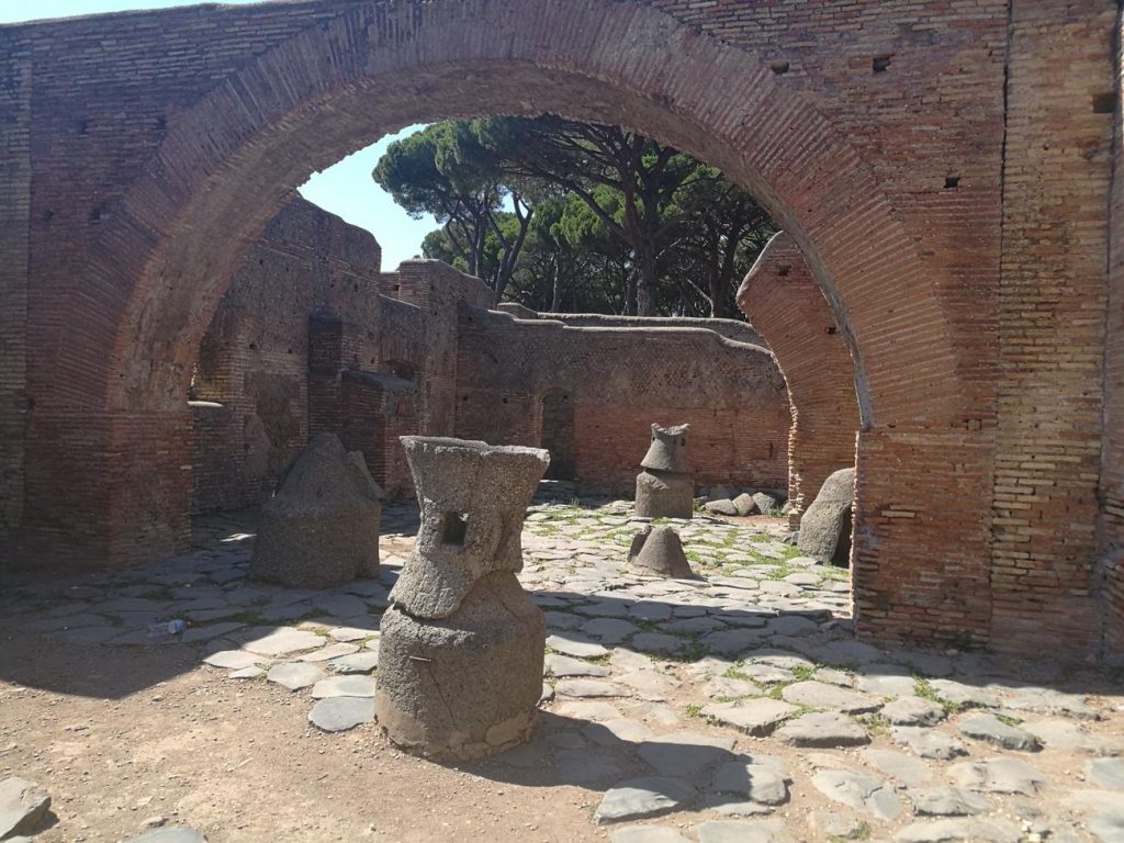 Pasando el Teatro a la derecha están los Templos Republicanos y a la izquierda la Sede de los Augustos y un poco más adelante la Grandi Horrea, cuyo significado es el gran granero, que era un tipo de almacén utilizado en la época romana para el almacenamiento de diferentes tipos de alimentos, y mucho más adelante en el Decumano, la Horrea Epagathiana. Al lado de la Grande Horrea se encuentra el Molino del Silvano en el Caseggiato dei Molini, sitio de mucho interés para mí ya que me dedico a trabajos de investigación relacionados con la molinería y la calidad de panes funcionales. El Panificio di via dei Molini fue construido en el s.II d.C. y fue una gran panificadora ostiense que producía pan incluso para Roma. En este lugar se desarrollaba el proceso de elaboración de pan, como puede deducirse de las diferentes piezas de piedra volcánica encontradas en el caseggiato (molino, cuenco para la masa, horno), desde la molienda del grano, pasando por la formación de la masa a la venta al minuto en las tiendas que se encontraban frente al edificio.