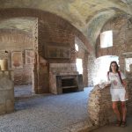 Y por esos lados, ya no recuerdo dónde, porque nos fuimos metiendo en el laberinto, llegamos a una vivienda del Caseggiato del Thermopolium; estas casas constaban de habitaciones y taberna que se desarrollaban en torno a un patio y generalmente compuestos por planta baja con entrepiso, primer y segundo piso. Enfrente al thermopolium encontramos las viviendas de las pinturas y la casa de Diana. Luego pasamos por el Capitolium y enfrente encontramos el Foro (Templo de Augusto y Roma). A esta altura ya estábamos cansadas con el peso del calor de un día de mediados de julio y perdidas con tantas viviendas por lo que comenzamos a perdernos, sin seguir el mapa, y a subir escaleras hasta que nos encontramos con una hermosa vista superior de la ciudadela.