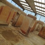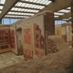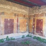 En esa tónica de dejarnos llevar, llegamos a un sitio no abierto al público, que a mi criterio le dio a este recorrido un sentido de descubrimiento no esperado, encontramos la Insula delle Ierodule, una casa que forma parte del círculo exterior de las casas del Jardín Adriano. Este sitio que fuera derrumbado aparentemente por un terremoto en el s. III, fue encontrado por excavaciones en el año 1969. El edificio es famoso por su decoración pintada en paredes y techos, excepcionalmente bien conservado, tal como se muestra en las fotos tomadas en puntas de pie y haciendo malabares para posicionar el celular a través de uno de los orificios de la reja… en fin… picardía o antojo de viajera. Los mosaicos y las pinturas encontradas al momento de la excavación, todavía adheridas a las paredes y el techo son uno de los ejemplos más importantes y significativos de la decoración ostiense de la edad media imperial. Las pinturas muy refinadas con fondos amarillos, rojos y bordó datan de alrededor del año 130 d.C. y contienen representaciones de delfines, pájaros y flores. En las pinturas de la sala 4 se observan figuras femeninas danzando o en acto de liberarse, un delfín, instrumentos musicales y columnas. En la sala de representación, las paredes están divididas en tres registros amarillos por dos columnas de fondo rojo, en el centro se representan delicadas figuras. En todas las habitaciones, cuyos suelos están decorados con mosaicos con simples decoraciones en blanco y negro, la pared inferior de las paredes está decorada con un zócalo amarillo y rojo del que emergen cabezas vegetales, hipocampo, vasijas con flores, siendo algunos motivos vagamente dionisíacos. Para la coloración de muros y frescos se utilizaban preferentemente pigmentos minerales formados por compuestos metálicos (Cagnana, 2000) con hierro, manganeso, plomo, cinc, cromo, cobre, entre otros; principalmente óxidos, como el óxido férrico (Fe2O3) que tiene un particular color ocre. El nombre de Insula delle Ierodule fue otorgado al momento de la excavación y en el que se decidió atribuir a las figuras femeninas representadas en las pinturas, la función de las prostitutas sagradas. Luego de la individualización de un grafiti inscripto en la pared de uno de los ambientes, interpretado como el recogimiento del voto por parte de Lucceia, se ha redenominado a esta casa como Insula di Lucceia.