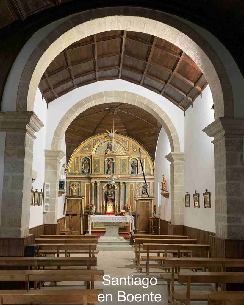Y de Melide salimos, en dirección a Arzúa. Una de las primeras paradas fue la iglesia de Santiago en Boente que nos gustó en especial, con sus paredes blancas y un interior en el que destaca el artesonado en madera del techo.