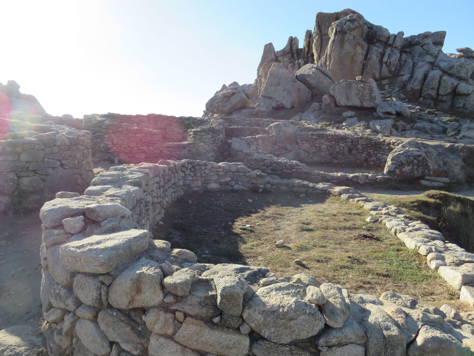 Se accede al interior por una puerta monumental con escalinata. Una vez dentro podemos observar unas treinta construcciones de forma redonda u ovalada, no todas servían como vivienda, se piensa que eran usadas para desarrollar actividades artesanales o como almacén. Podemos observar que las distintas construcciones se van adaptando a la orografía del precioso promontorio sobre el mar.
