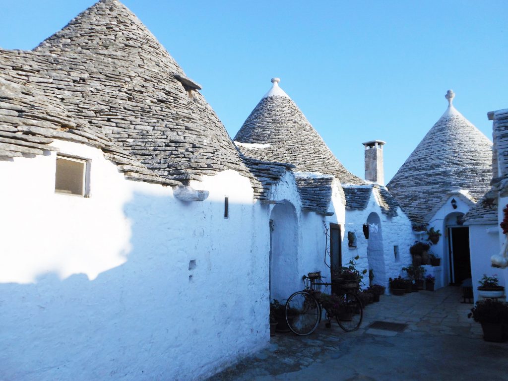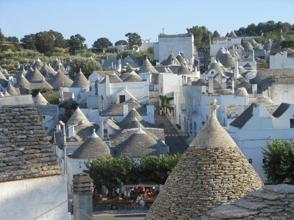 Alberobello («Ajarubbèdde» en apulo-barese) es una ciudad pequeña, un municipio italiano de aproximadamente 11.000 habitantes sito en la provincia de Bari, región Puglia. Alberobello en italiano es la conjunción de dos palabras “albero” árbol “bello” bello relacionado con la frondosa vegetación de la zona con tierra cultivable; pero en realidad el nombre actual deriva del latín medieval de la región “silva arbolris belli”. Alberobello era a principios del siglo XVI un pequeño feudo bajo el dominio de los Acquaviva de Aragona (condes de Conversano) que fue poblándose de campesinos dispuestos a trabajar la tierra fértil. Los condes autorizaban a los colonos a construir sus casas de piedra seca pero sin cemento, para poder ser derruidas en caso de inspección regia (inspección ordenada en 1644 por el duque Caracciolo de Martina Franca), ya que existía desde el siglo XV una norma en el Reino de Nápoles denominada “Prammatica de Baronibus” que exigía el pago del tributo para el establecimiento de una aglomeración urbana. De esta forma, los trulli eran construcciones precarias de fácil demolición que se destruían para evitar el pago de dicho impuesto.