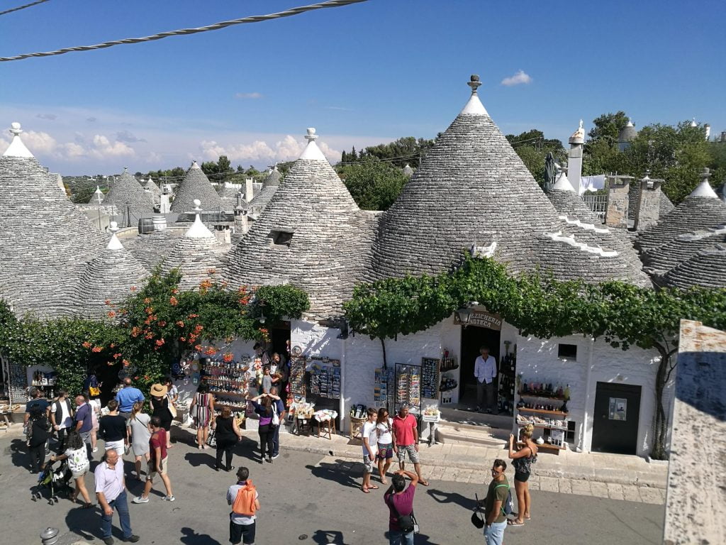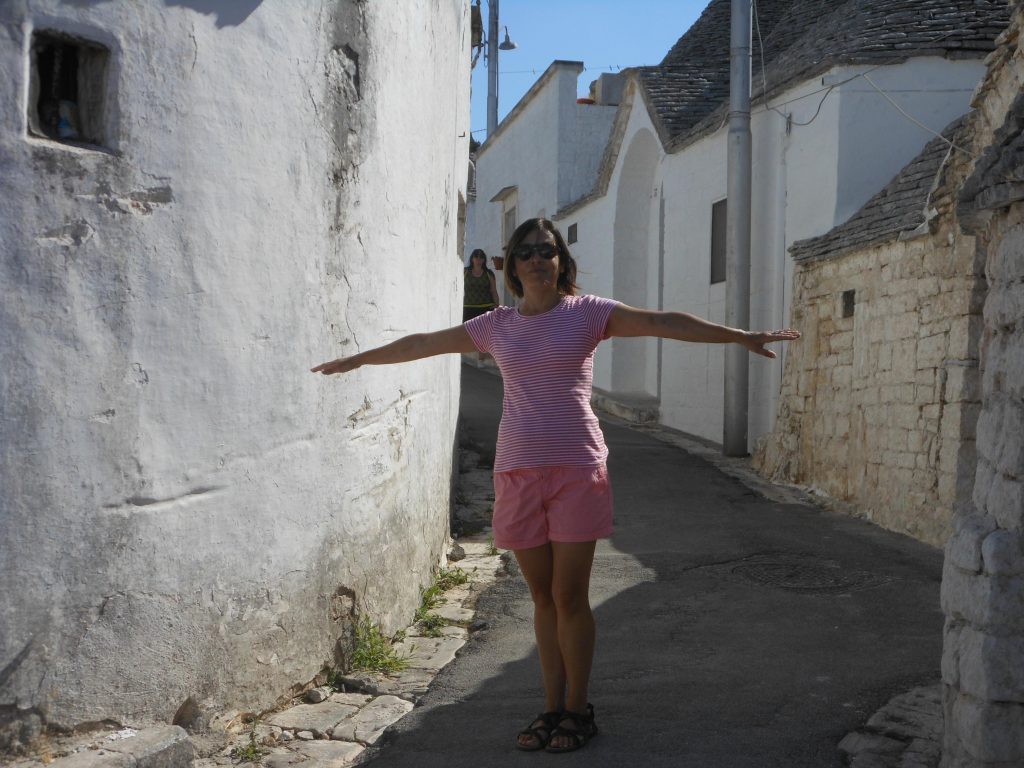 Yo no tenía idea de la existencia de esta ciudad hasta que mi amiga Luz Picos Freire subió fotos al Facebook del lugar. Y me enamoré inmediatamente, porque es un lugar realmente encantador. Así fue que busqué en diferentes sitios de internet y en uno de ellos proponían como una de las cosas que uno no puede dejar de hacer antes de morirse: “dormir en un trullo de Alberobello”. Así fue que nos hospedamos en un trullo del Typical Resort in Trulli , realmente una experiencia única. Pero la historia fue llegar al hospedaje, toda una odisea que paso a detallar. Llegando a Alberobello el GPS del coche nos iba guiando y adentrando en la ciudad, hasta que súbitamente sugirió girar a la izquierda por una calle pequeña en cuyo inicio tenía una valla con un cartel de “acceso vietato” (prohibido pasar) al que por supuesto, como argentina que soy, no le presté atención. Pasamos y a medida que nos adentrábamos las calles se iba haciendo cada vez más pequeñas, hasta que pasé por una muy estrecha que cuando vi hacia atrás no sabía cómo lo había logrado. Dejamos estacionado el coche y muy nerviosas nos dirigimos al hotel. Cuando llegamos le explicamos al chico que atendía en el mostrador, Alessio, lo que nos había sucedido. Me dijo que por dejar el coche en el caso histórico, ponían multas abultadas. Y yo le dije “no puedo mover el coche de donde está, lo pude entrar pero no lo puedo sacar!!!”. Alessio se apiadó de mí y fue con nosotras al lugar donde dejamos aparcado el coche con todas las valijas dentro….y lo logró sacar y estacionar en un lugar permitido cerca de nuestro trullo! Luego volvimos al lugar por donde logré pasar el coche…ameritaba una foto!.