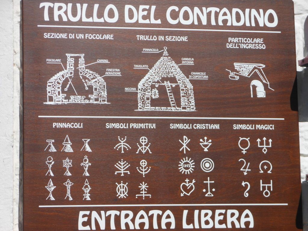 Un mayor gasto en la construcción del trullo permitía por lo tanto individualizar las más pudientes de aquellas más pobres. Los símbolos pintados sobre los techos de los trulli a menudo asumían un significado religioso; a veces podían representar los signos del zodíaco. Debido a que a Alberobello se le negó por un largo período el reconocimiento oficial por parte de los condes de Conversano, los pináculos y símbolos pintados formaban juntos una especie de identificativo ciudadano.