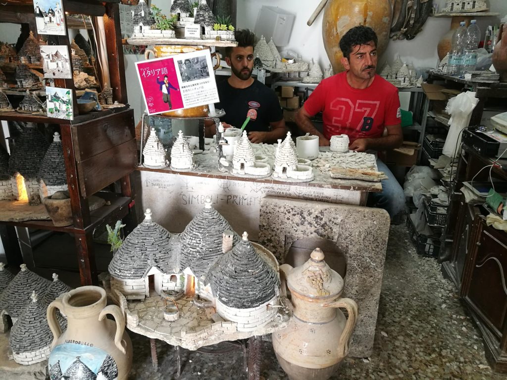 En la recorrida, metiéndonos por entre los trulli de rione Monti vimos diferentes negocios de artesanías decorados por fuera con plantas florecidas. En uno de ellos veo a dos hombres trabajando in situ la reproducción de trulli en adornos tipo lámparas u hornillos aromatizadores. Le pregunto a uno de ellos si podía tomarle una foto y me responde “si su marido la deja” y le respondo “no tengo marido” a lo cual contesta “entonces tome todas las que quieras”…a pesar del dejo de machismo, con el tono italiano resultó graciosa la respuesta.