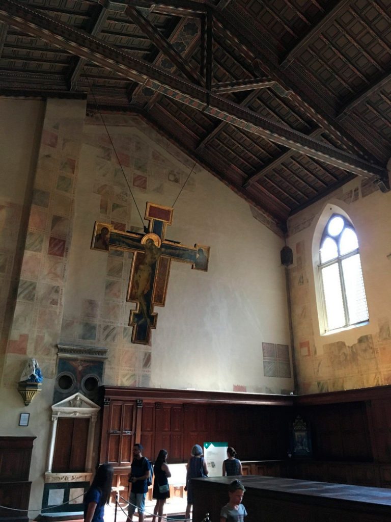 En el interior encontramos un cierto contraste entre la belleza del mármol de la fachada y la austeridad interior. Es particularmente atractivo visitar el Cimabue, el Cristo crucificado que iremos encontrando en muchas iglesias y catedrales en la Toscana. Este es especialmente bello y sufrió por la gran inundación del Arno en 1966, teniendo que ser restaurado con la participación del Opificio delle Pietre Dure (una institución con este nombre se merece cualquier tipo de ayuda o subvención, seamos sinceros).