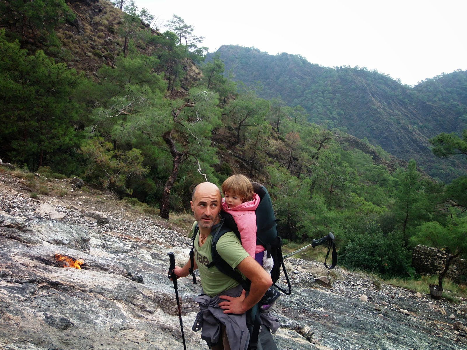 Todavía arden hoy en día unos 20 fuegos en las laderas del montaña, a los que se llega caminando por un espectacular paisaje de montañas calizas con olor a pino y al cercano mar. Resulta increíble ver estos fueguitos brotando de la roca…y brillando en la lejana oscuridad, desde la playa en la que nos quedamos, al caer la noche. Estas llamas eran mucho más intensas en la Antigüedad, hasta el punto que servían de guía a los marineros que navegaban por estas costas.