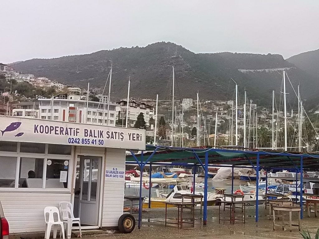 No muy lejos, a Finike, donde también nos llovió esa noche…pero sin más. Finike es un pueblo grande y con una marina, donde tranquilamente dormimos, llena de barcos, tanto de pesca como de recreo. La mañana, ventosa y con restos de chaparrones, la aprovechamos para darnos una vuelta por la interesante cooperativa de pescadores de Finike, y comprar pescadito fresco. Y de paso un par de «çay» (té), en el barecito de los pescadores…