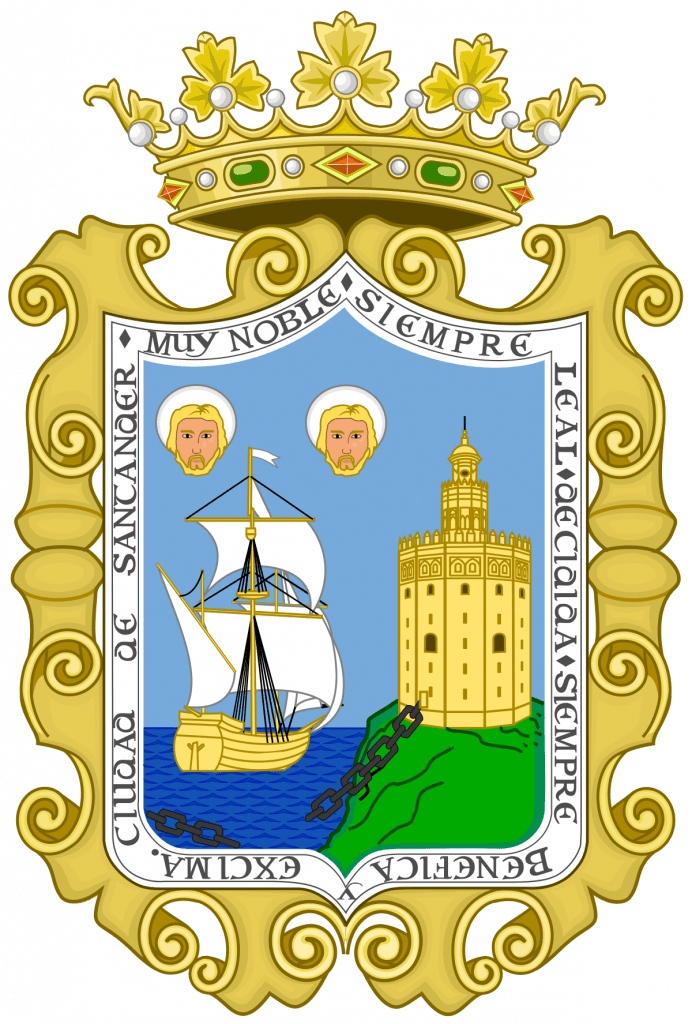 Se puede ver la Torre del Oro de Sevilla. El escudo conmemora la conquista de Sevilla por marineros cántabros al mando del almirante Ramón de Bonifaz y Camargo en el año 1248.