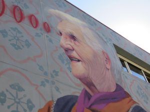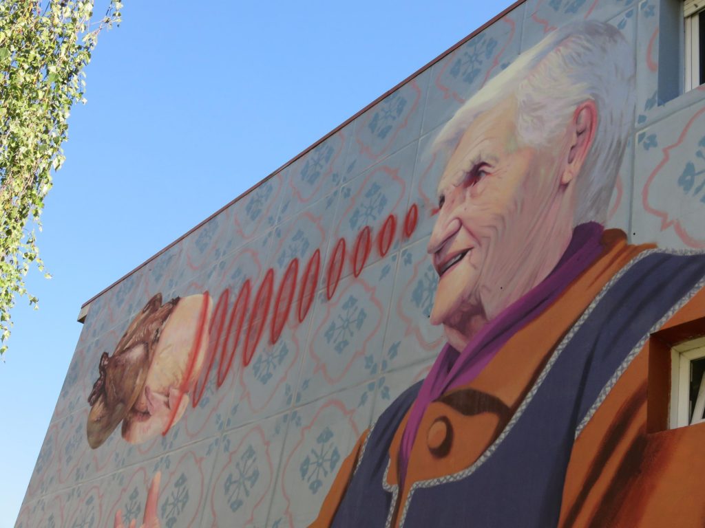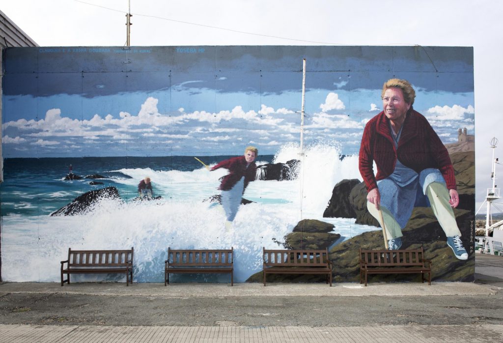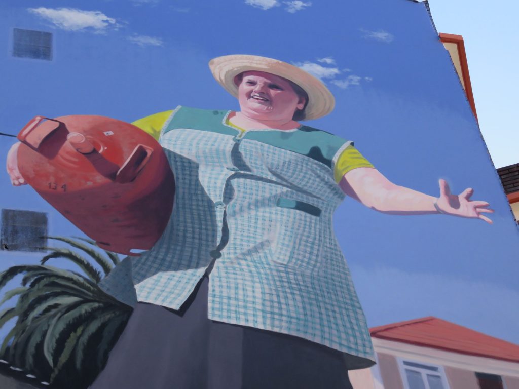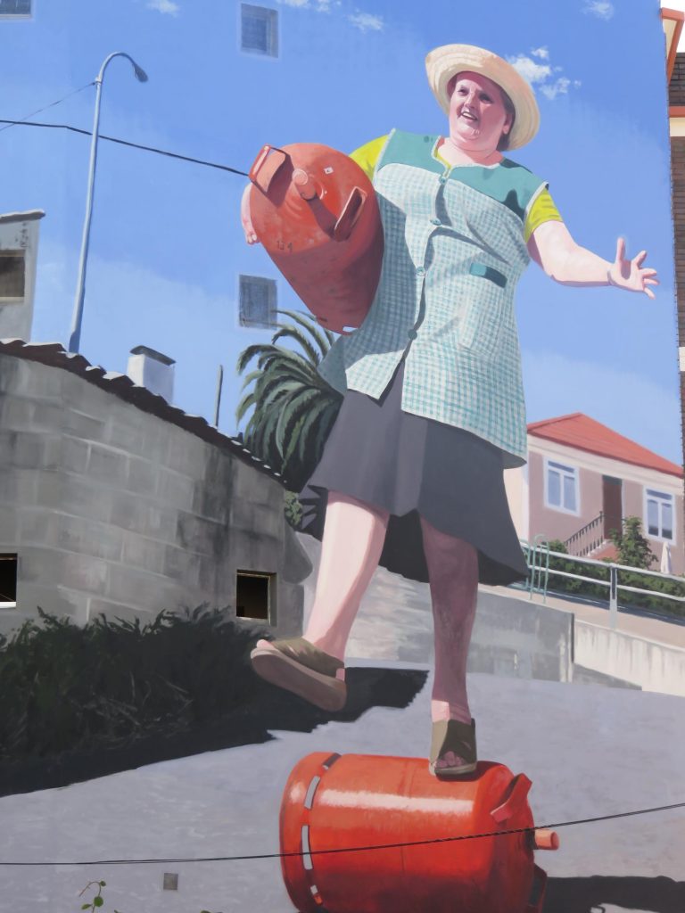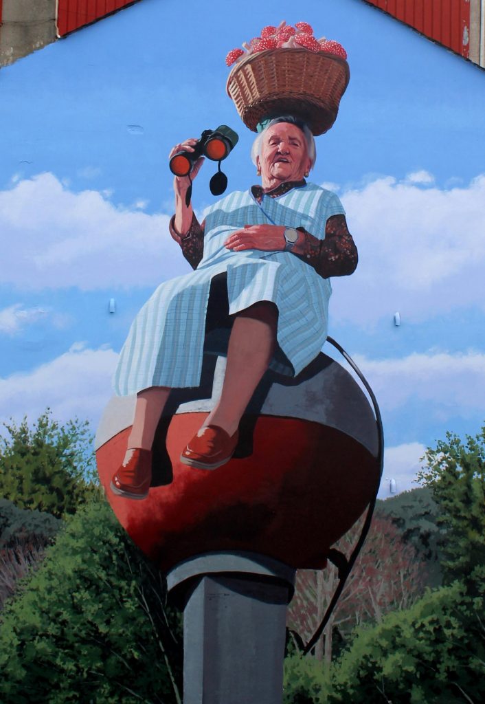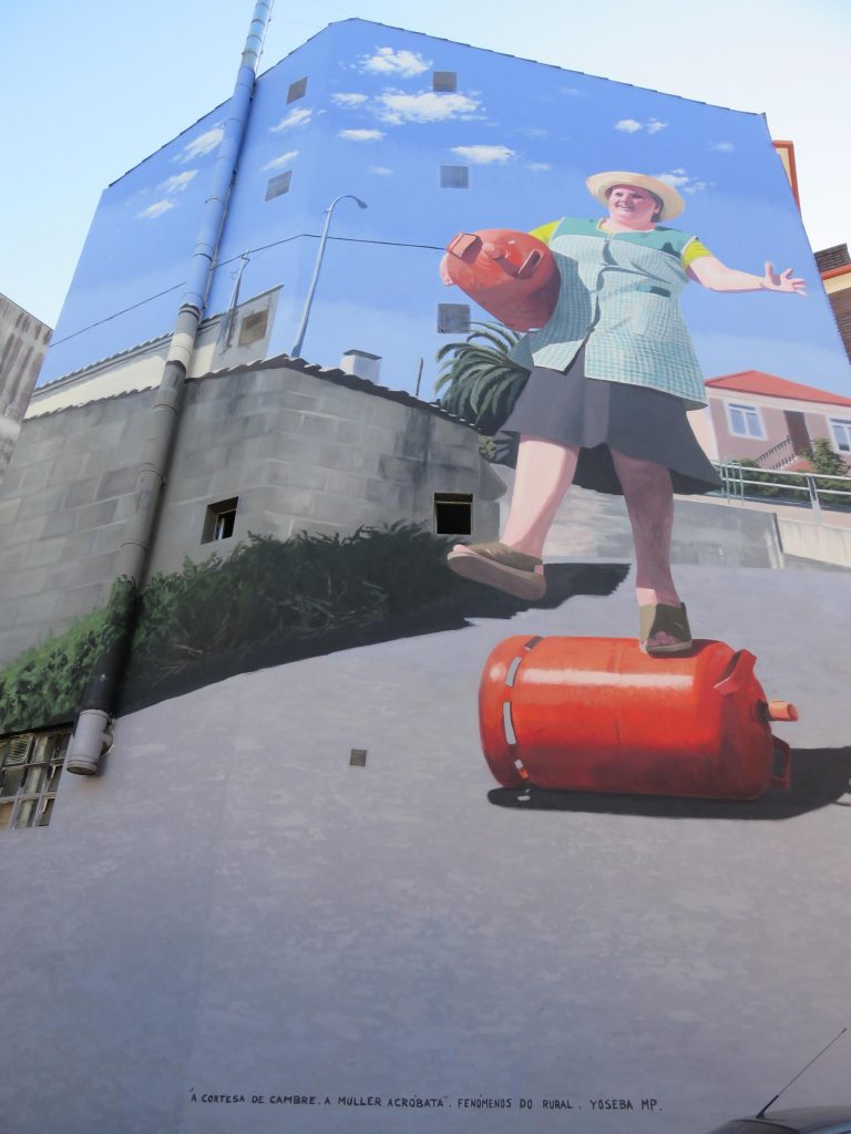 Yoseba Muruzabal nació en Cambre, en la provincia de A Coruña, y allí ha podido pintar también uno de sus murales. Nos referimos ahora a su obra «A Cortesa de Cambre, a muller acróbata». En este caso la modelo elegida es también la abuela de una de sus amigas, una antigua compañera de clase. Como nos cuenta en la entrevista que le hicimos para nuestro programa en Radio Viajera, la protagonista regentaba el bar «O novo» en Cambre. Era el negocio que habían abierto con los ahorros acumulados como emigrantes en Inglaterra, todo un «clásico de nuestra tierra», como bien dice el artista.