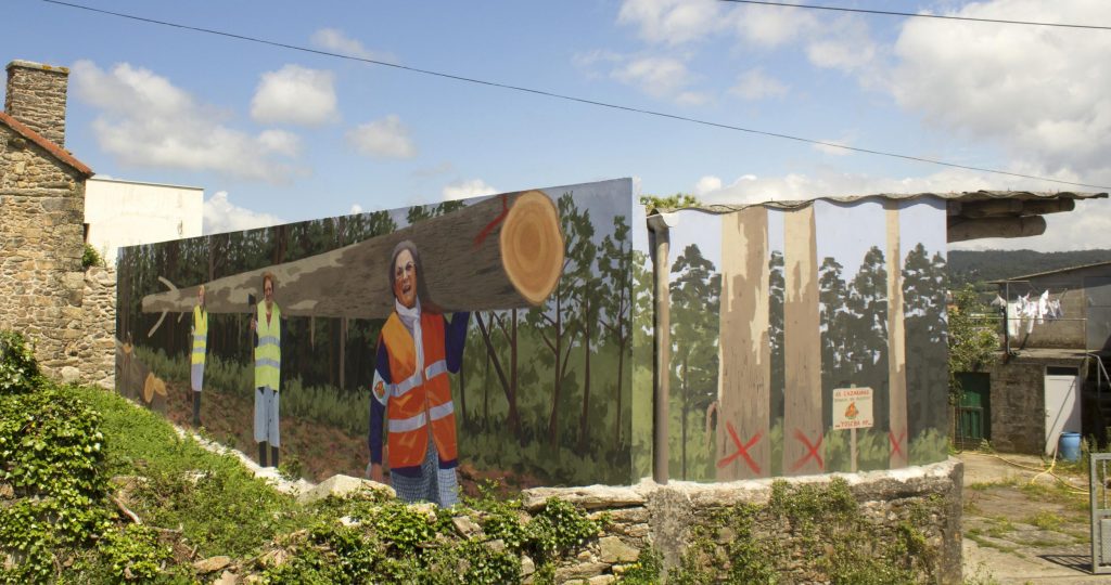 Una de esas carreteras de las que hablábamos antes es la N-550 que cruza Galicia de norte a sur, partiendo de Coruña pasa por Santiago, Pontevedra y Vigo para terminar en Tuy. Pues bien esa carretera pasa por la localidad de Ordes, y allí es donde podemos encontrar «A Greleira de 50 pes», que es el mural que inaugura esta serie. Lo pintó Yoseba en octubre del 2016 para el festival de pintura urbana Desordes Creativas, al ser animado por los organizadores a pintar en formato grande.
