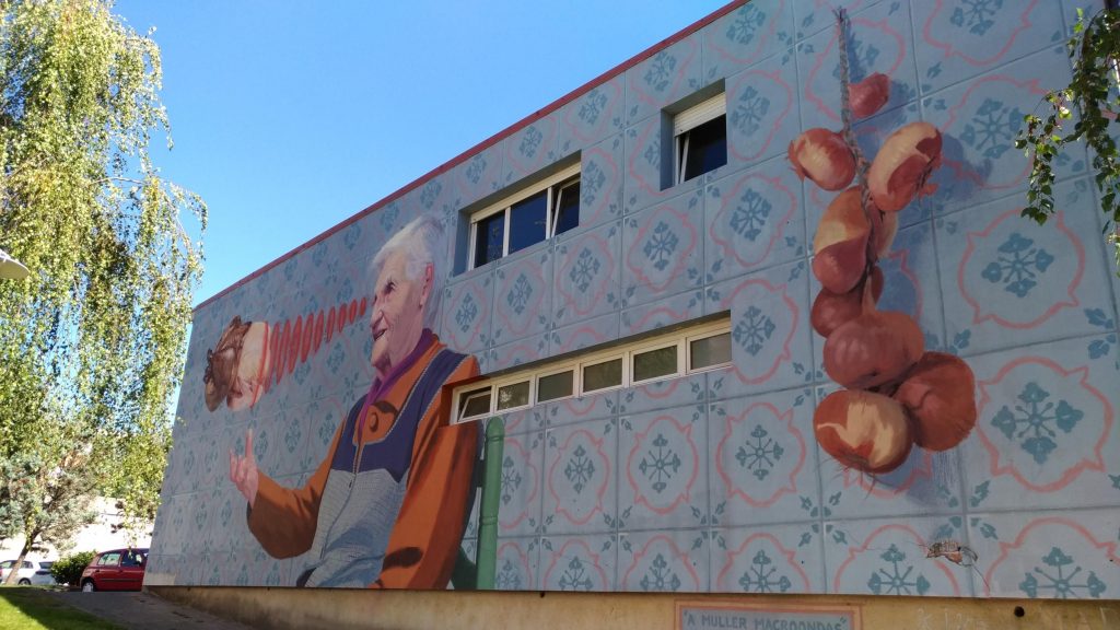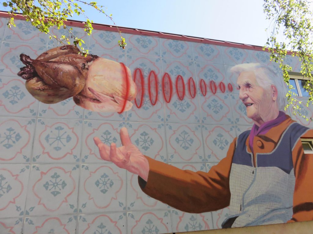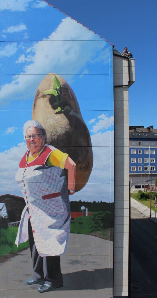 Los tiempos han cambiado, dice Yoseba, y ya «no vemos Meigas con escobas, vemos mujeres «Atómicas», vemos «Fenómenos do rural», abuelas que pueden asar pollos con los ojos porque llevan toda la vida despellejándolos». Estamos hablando de «Balbina, a muller macroondas«, el primero de los murales que El Viajero Accidental contempló en directo cuando se interesó por conocer todas estas obras pintadas por el artista que hoy nos ocupa.