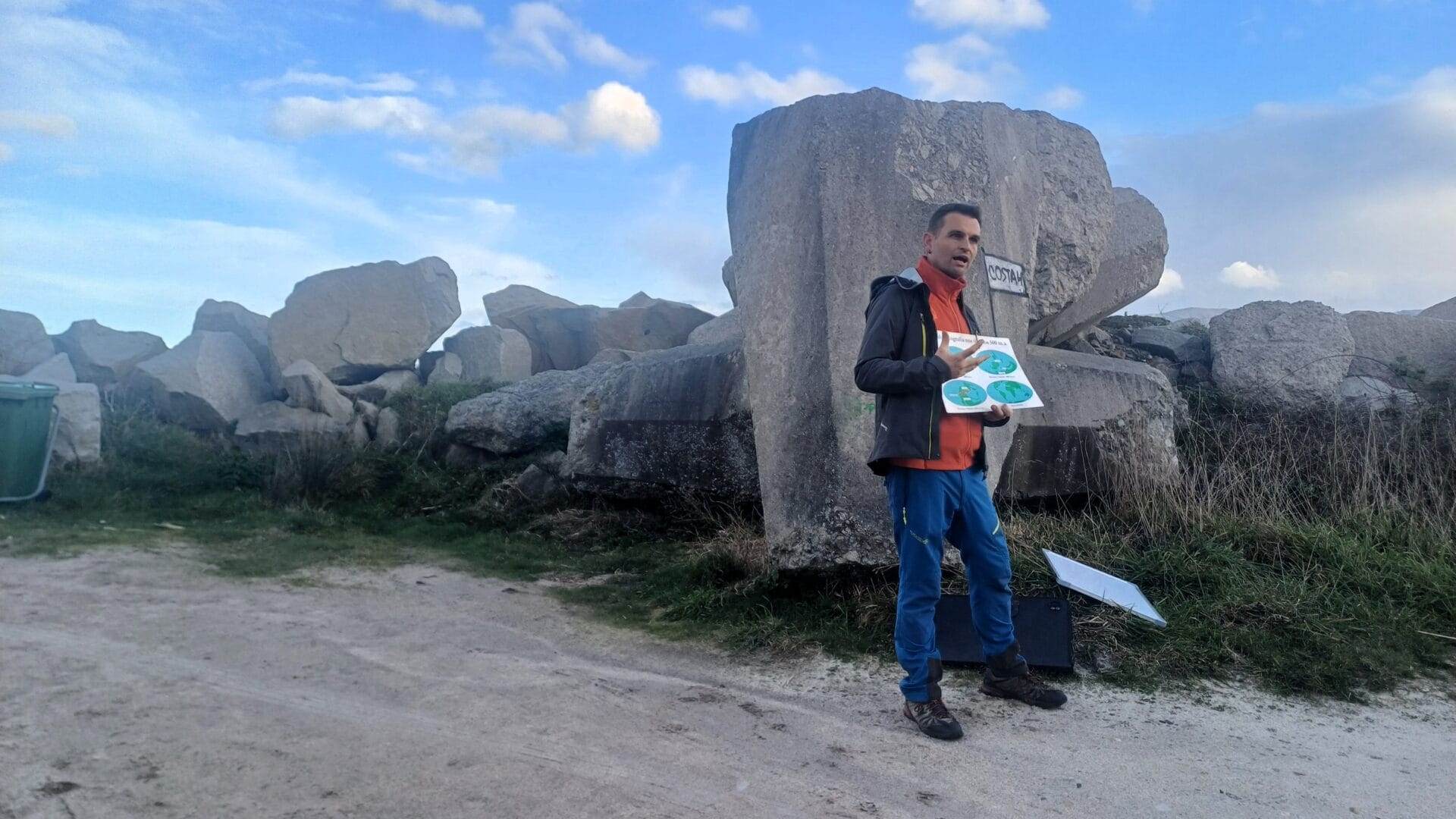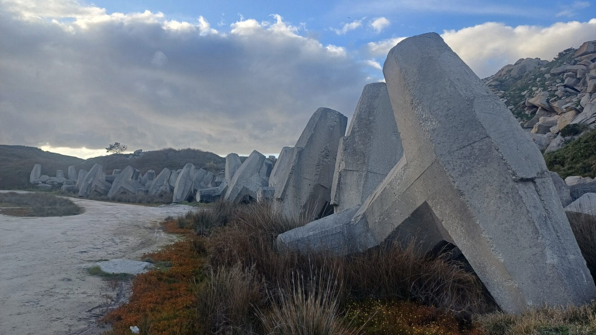 Lo primero que te sorprende cuando te acercas a la ruta es la presencia de enormes bloques de hormigón que quedaron allí depositados. Esos bloques, llamados dolos, son como los que se utilizaron para la construcción del puerto de San Cibrao pero por diversas razones, como por ejemplo tener algún defecto, no fueron usados. Ahora contribuyen a generar un paisaje único, bello y diferente al estar al lado de las formaciones graníticas. El entorno es espectacular.
