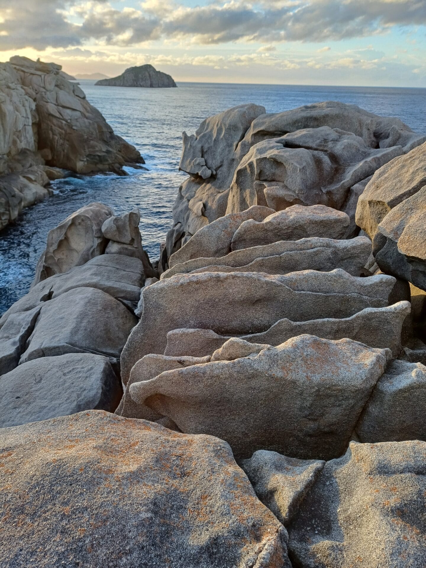 Desde lo alto contemplamos los islotes al atardecer, todo un placer para los sentidos. Este bonito lugar cuenta además con el incentivo de poder observar los islotes Os Farallóns.