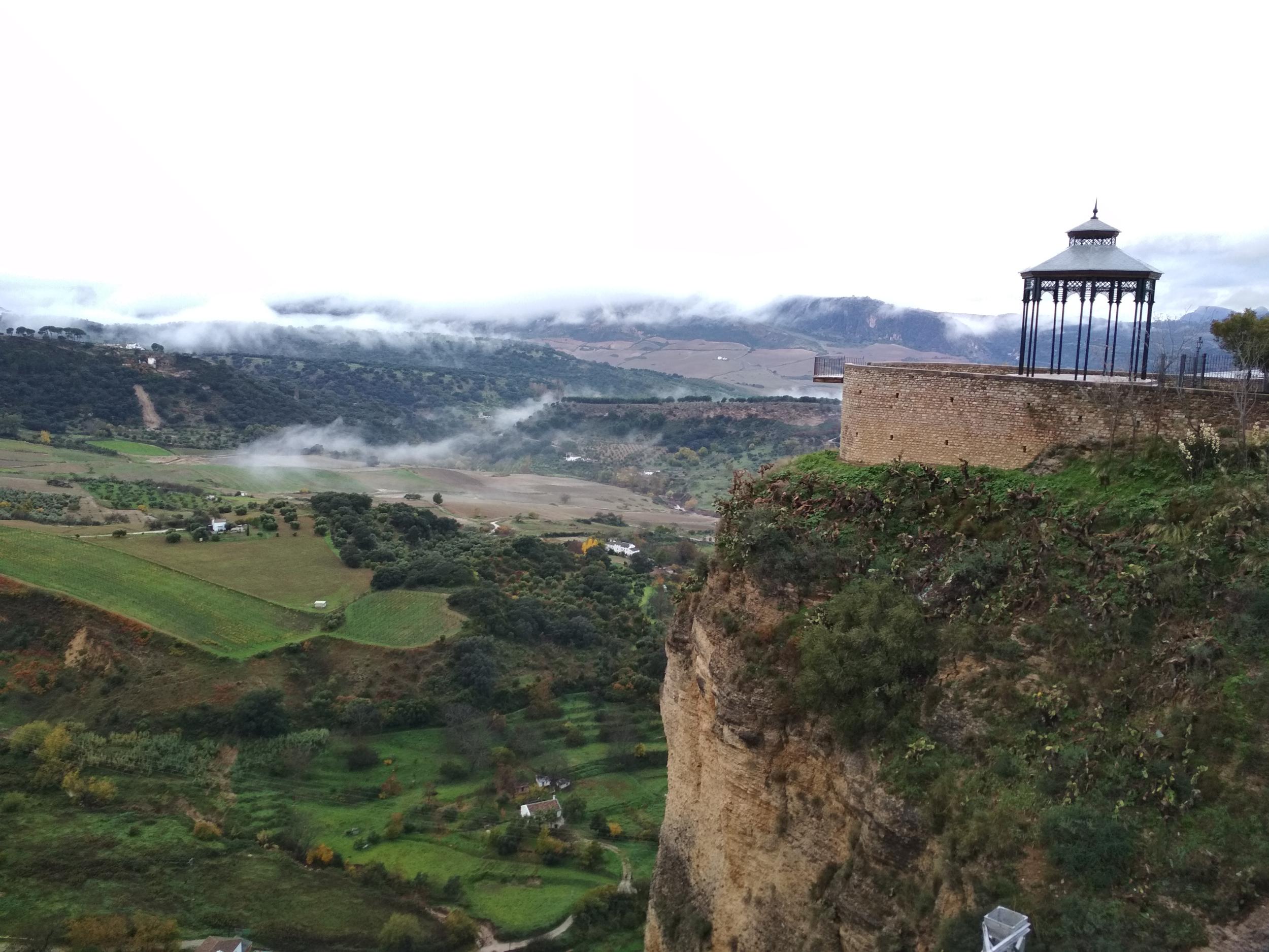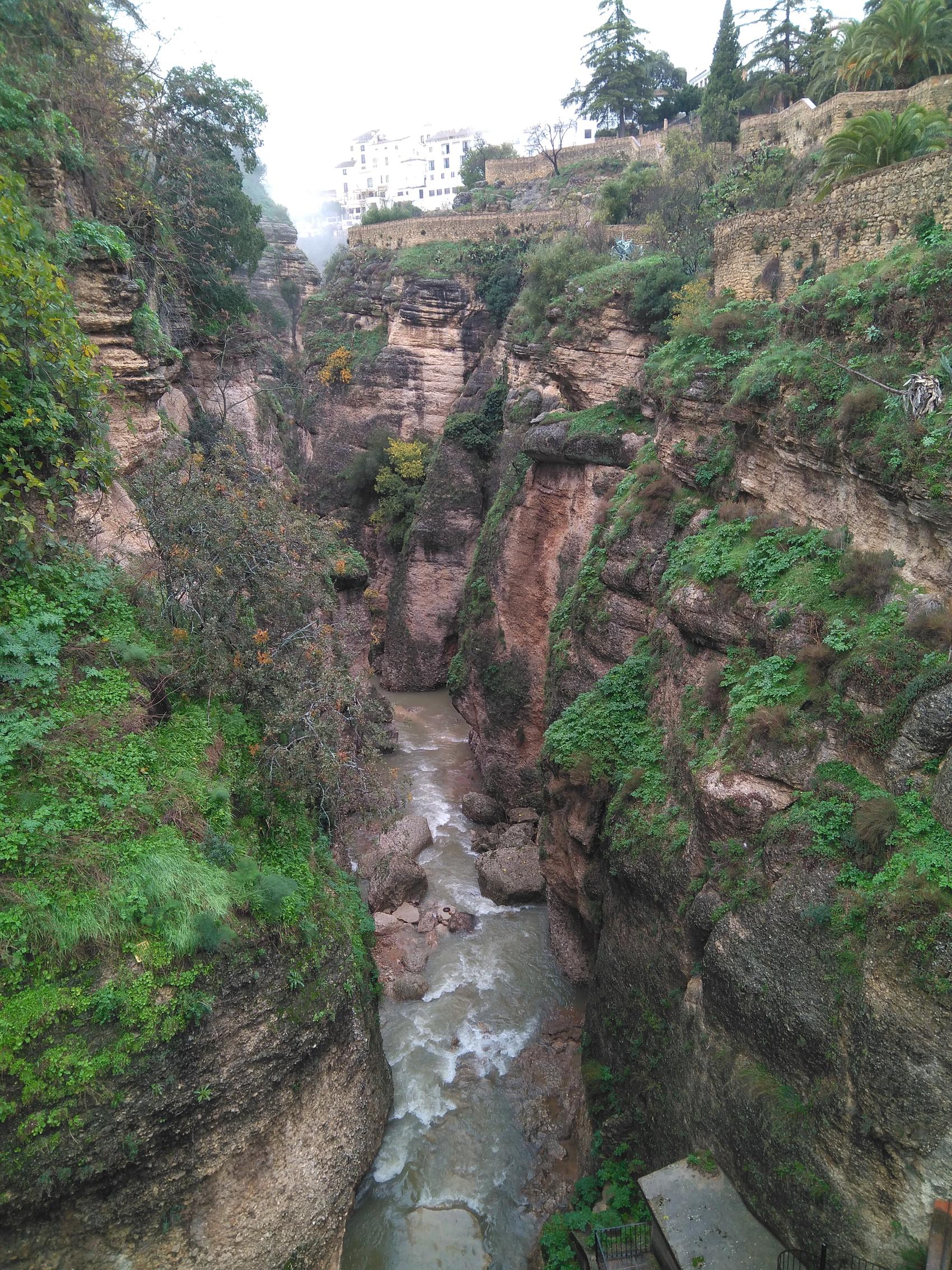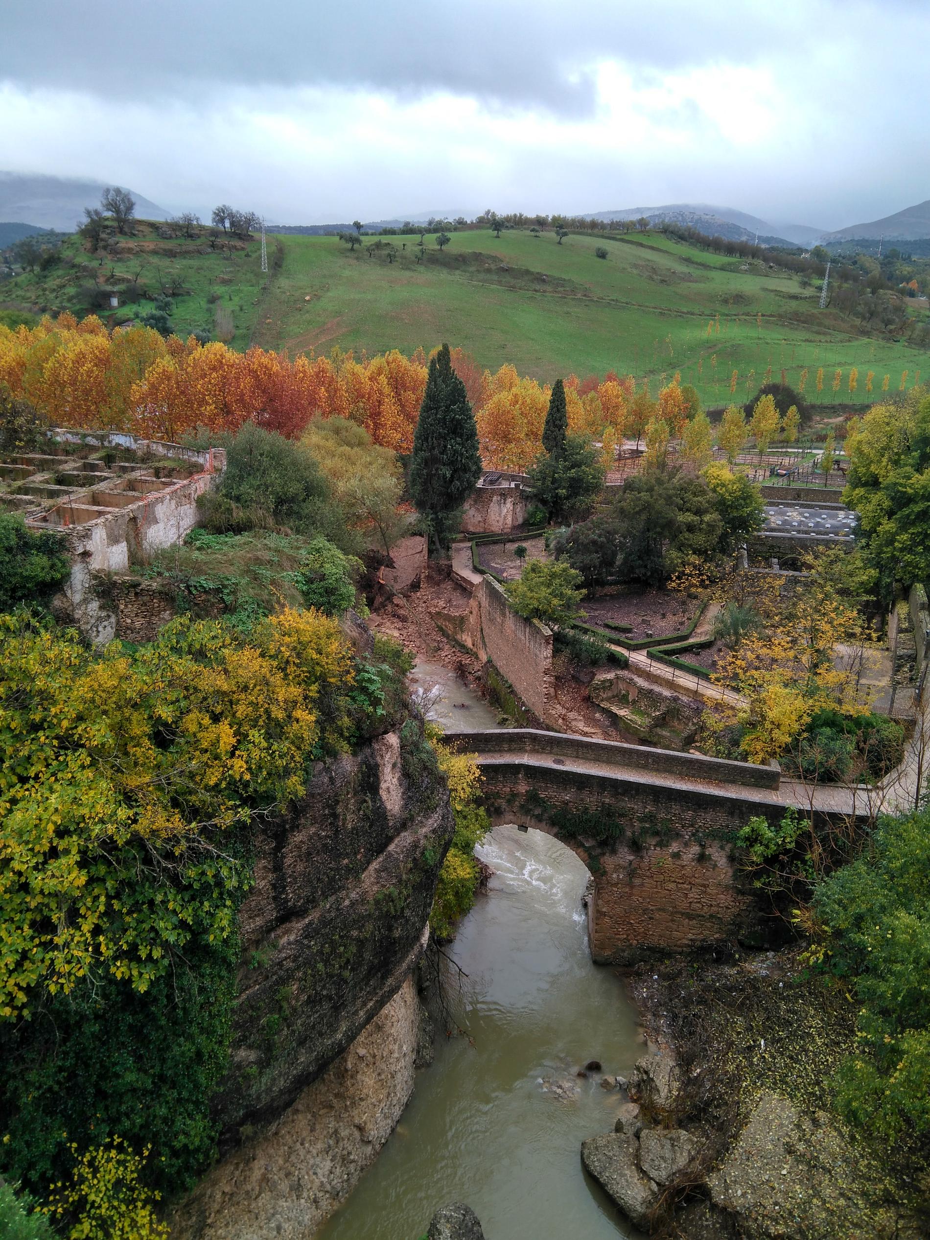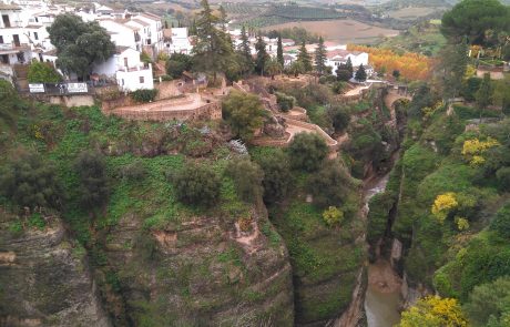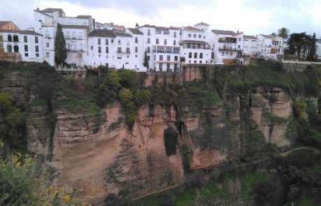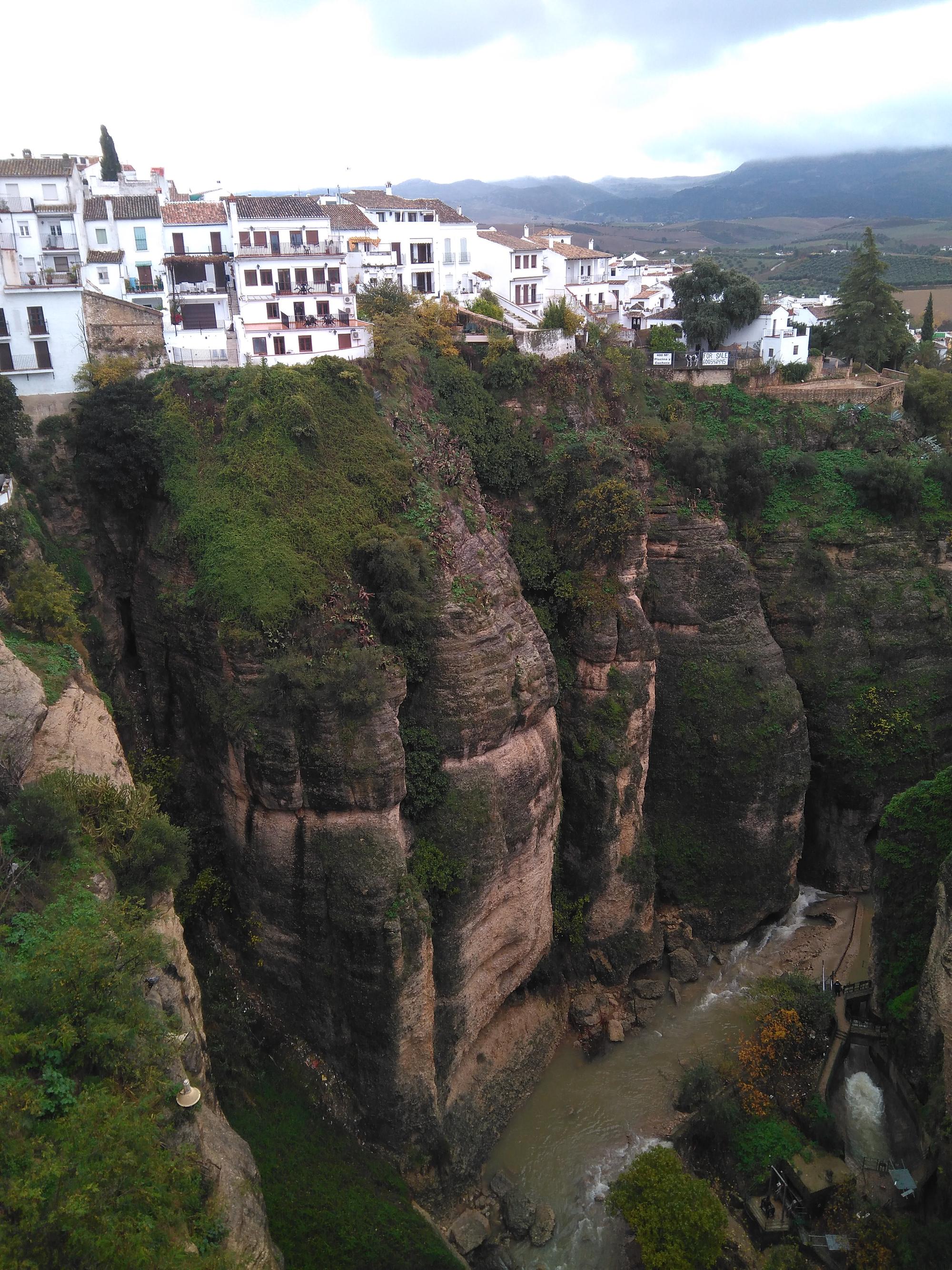 La primera parada fue Ronda. Siempre habíamos oído hablar de ella, de lo bonita que era, y, cómo no, del “Tajo de Ronda”. Pero no solo es bonita, es impresionante. Está situada en un alto rocoso, haciendo que la ciudad quede flanqueada por el oeste por acantilados de unos cien metros de altura. Además el Rio Guadalevín ha ido formando un cañón/desfiladero de esa misma altura que divide la ciudad en zona vieja y nueva. Las casas se encuentran al borde de sus paredes verticales desafiando la gravedad, no aptas para personas con vértigo. Con estas características no es de extrañar que esté hermanada con Cuenca. Las vistas tanto desde la ciudad hacia el valle y las sierras como las de la propia ciudad son impresionantes.