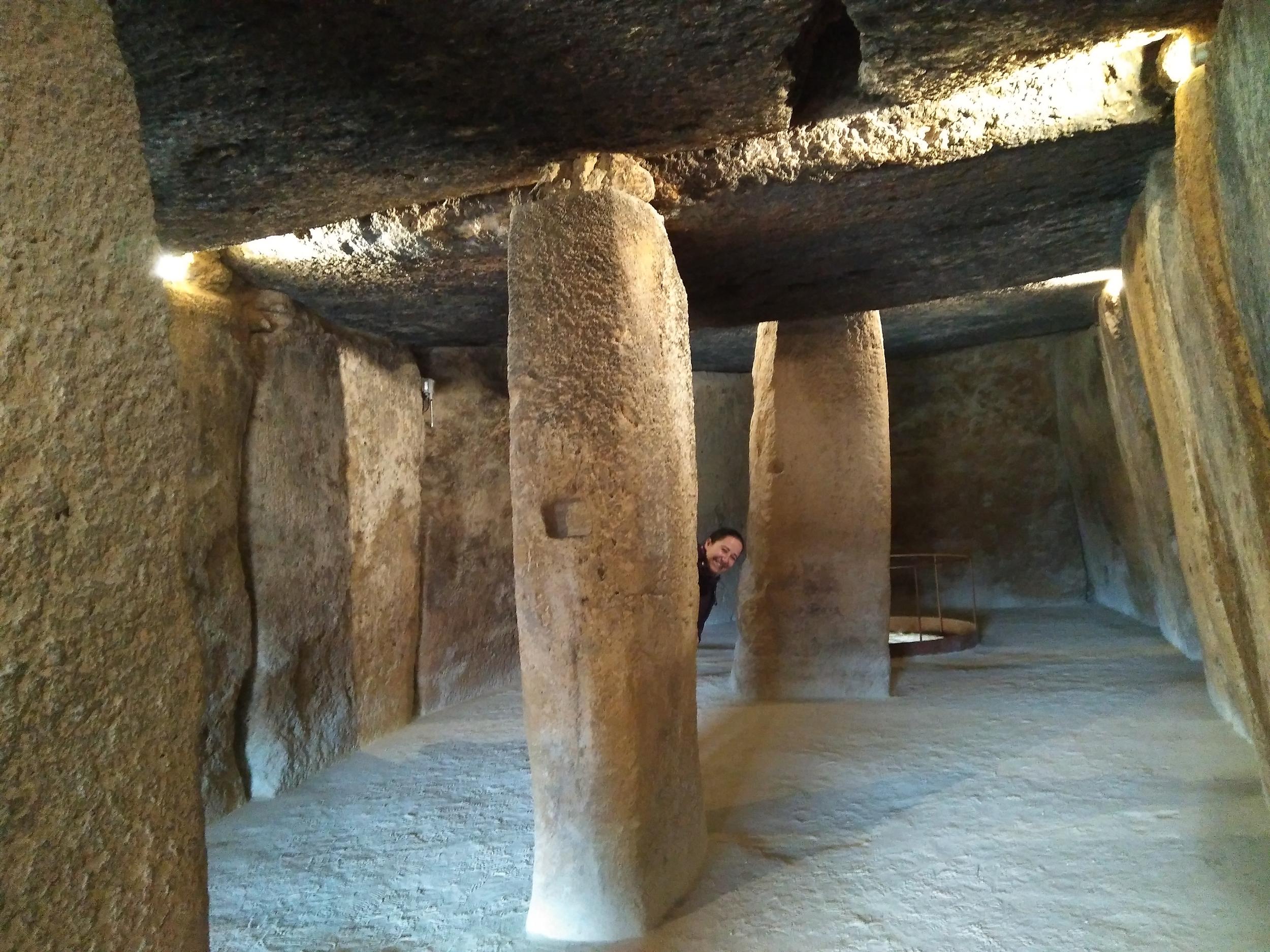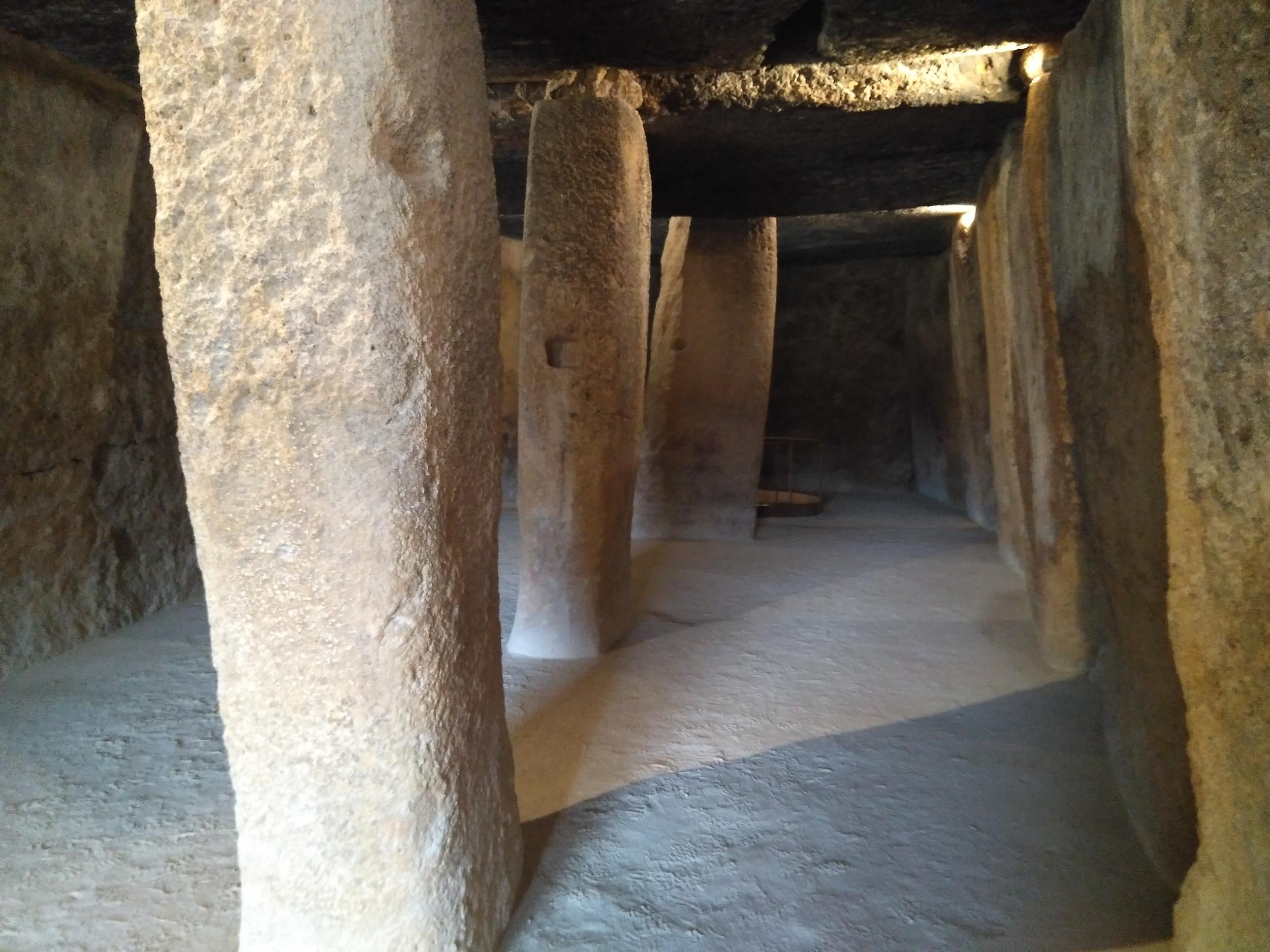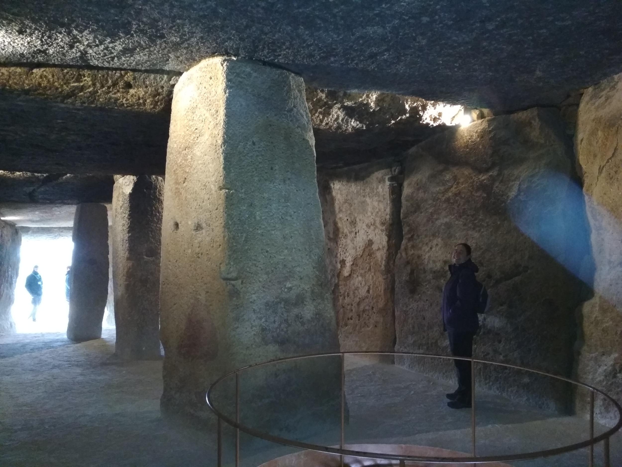 Siguiendo el recorrido marcado, el primer dolmen que nos encontramos es el de Viera, de más de 4.500 años es el mediano de los tres, un ejemplo perfecto de construcción megalítica e ideal para abrir boca, porque el siguiente en visitarse es el domen de Menga. Cerca de mil años más antiguo, con una altura de la cámara de unos 3,5 metros y 6 de ancho es único por sus dimensiones siendo el más grande de Europa. En él aparecen elementos arquitectónicos muy poco frecuentes que refuerzan su singularidad, 3 pilares en el centro de la cámara y su orientación hacia un elemento natural, la Peña de los Enamorados (un gran peñón con la forma del perfil de una cara), en vez de hacia elementos celestes. Dentro parece imposible que hace más de cinco milenios y medio fuesen capaces de realizar una obra tan colosal con una planificación tan exhaustiva, teniendo que mover losas de más de 150 toneladas y colocándolas con suma precisión; lo dicho, una obra de ingeniería.