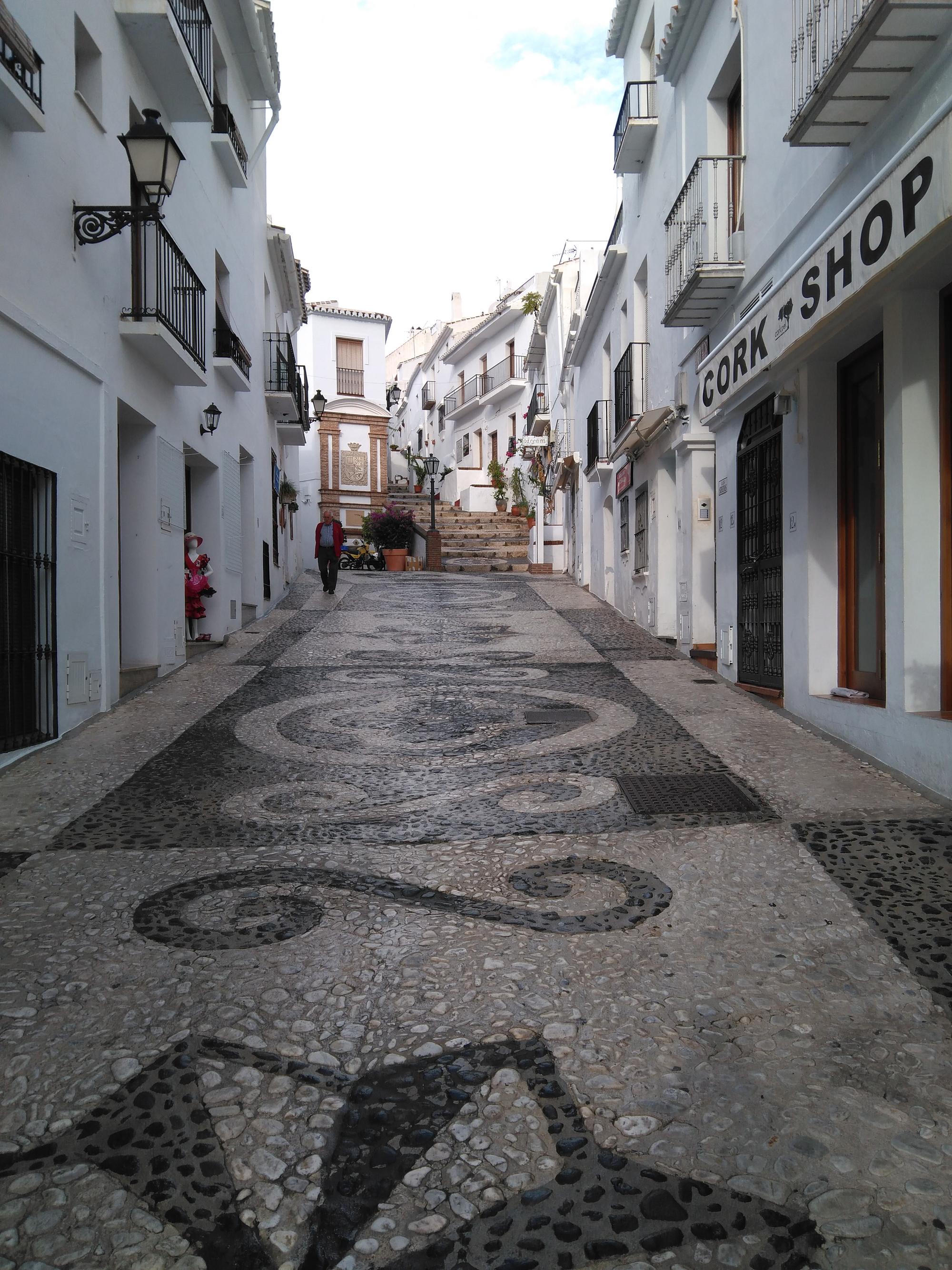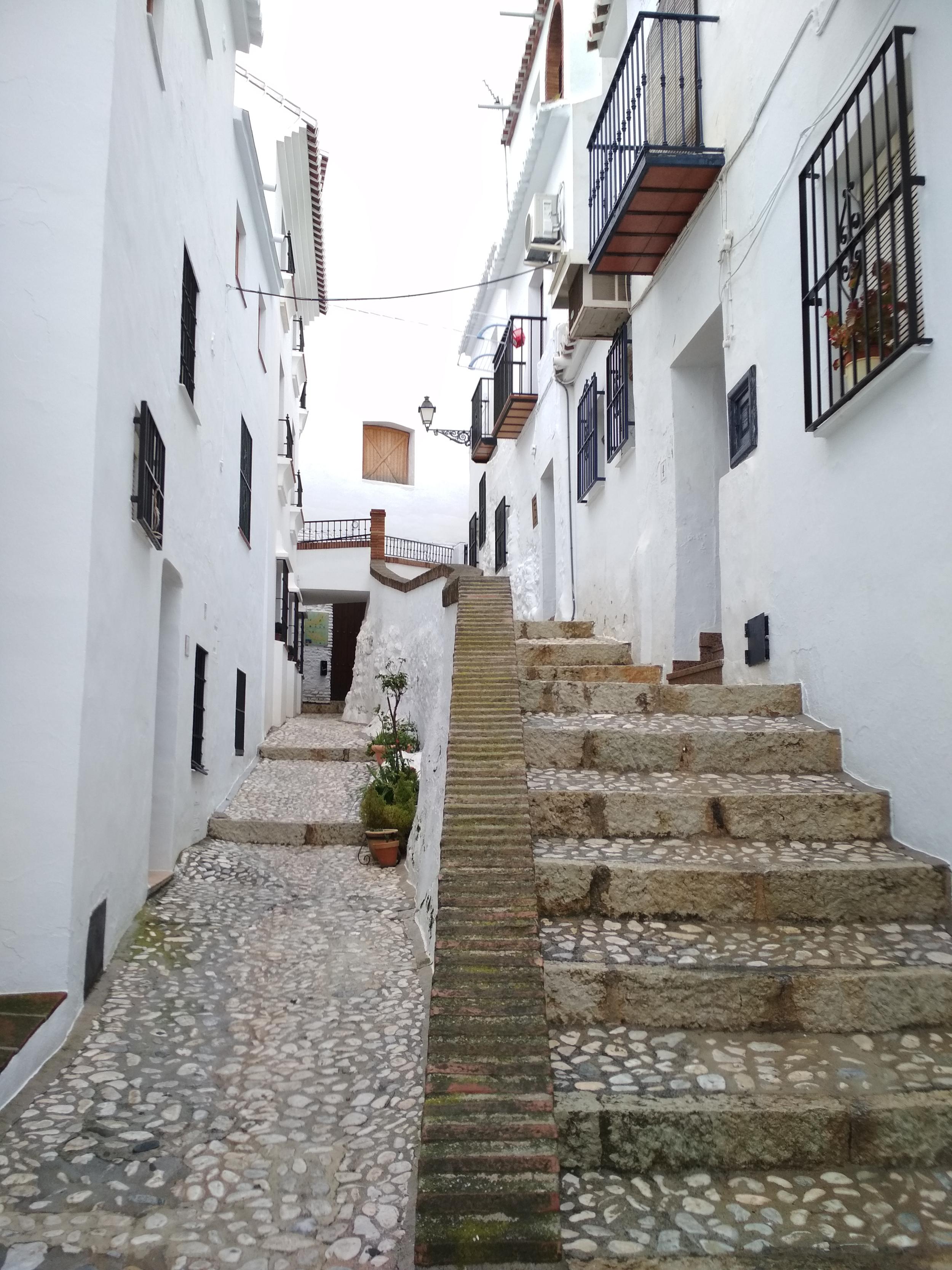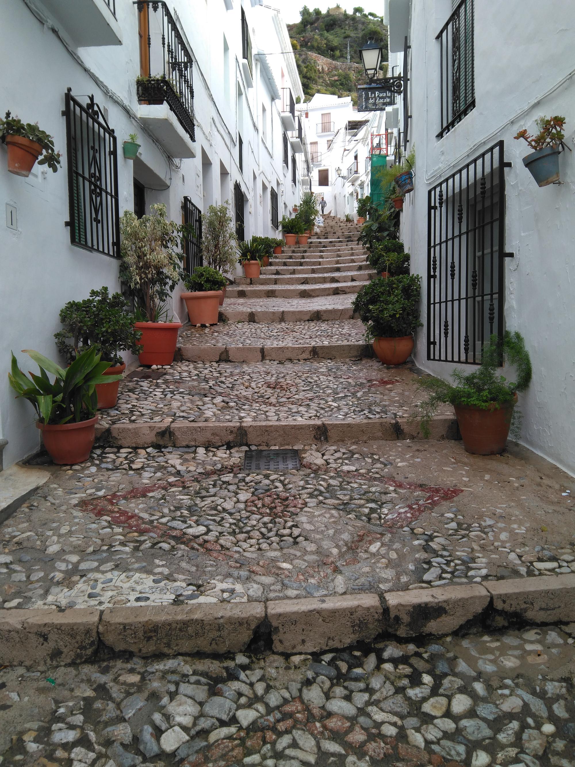 El último día lo pasamos por la comarca de la Axarquía. De entre sus pueblos decidimos visitar Frigiliana, de origen mudéjar y considerado uno de los más bonitos de Málaga. Situado en una ladera, y con sus casas encaladas, hacen que al irse acercando te deslumbre (el hecho de que llevásemos varios días sin ver el sol y saliese justo en el momento de llegar también ayudó). Su casco histórico mejora la visita, con calles empedradas y estrechas y escalinatas engalanadas con plantas. Un sito agradable y tranquilo donde evadirse paseando.