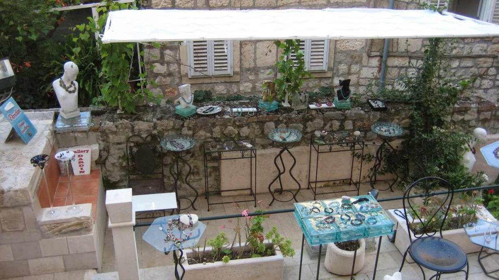 De nuevo en la ciudad, nos impresiona la cantidad de galerías de arte que hay, y que realmente vale la pena visitar y, si puedes, traer una pequeña obra de recuerdo. La calle de joyerías merece una mención aparte, con preciosas piezas en plata, otras con coral y por supuesto, los collares de perlas. La piedra caliza blanca característica de Croacia, que forma parte en Dubrovnik de los edificios más importantes, se extiende también a pequeños objetos ornamentales que puedes adquirir casi en cualquier establecimiento. El bordado de Konavle, una técnica de tejido en punto con dibujos simétricos también se puede encontrar en varios establecimientos, y en ocasiones puedes ver a la propietaria tejiendo en el local. Si sales de la ruta conocida, encontraras tiendas con mucho encanto en donde los propietarios te atienden con mucha calma. En fin, para varias tardes entretenida.