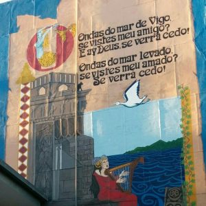 El mural que rinde tributo a Martín Codax está en una pequeña plaza de la villa marinera de Bouzas, no podía ser de otra manera. Y ahí está, acogiendo a propios y extraños, hasta que lleguemos a nuestro mar. Este precioso mural es obra del el artista vigués Juan Sardina.