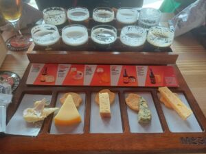 Nuestra visita al museo MEGA incluía un maridaje de cerveza y quesos gallegos que ese día fueron: Biscato Xiros (Lugo), Mouro (Coruña), San Simon de Costa (Lugo), Savel (Chantada) y Galmesano (Coruña).