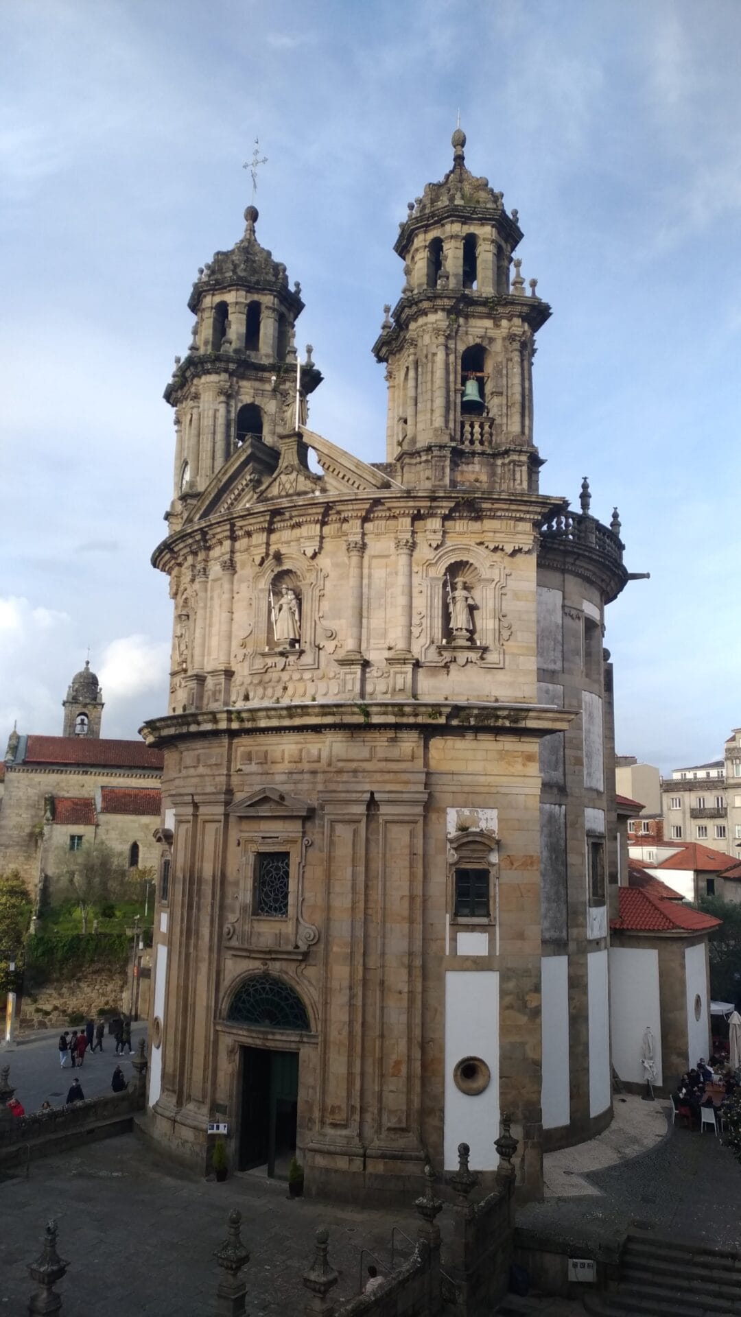 Esta iglesia tiene la peculiaridad de que su planta tiene forma de concha de vieira, símbolo de los peregrinos y del Camino de Santiago. En su interior la imagen de La Peregrina que hoy contemplamos es del año 1867 y fue tallada por el escultor catalán Luis Vermell. Sustituyó a la imagen de 1776 que había realizado el escultor pontevedrés José de Torres. La talla del Niño es del año de 1814 y es obra de Gambinus.