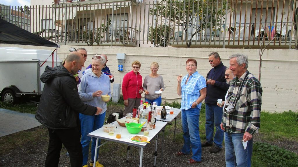 El público, más o menos el habitual: franceses, alemanes, otros más nórdicos como suecos y hasta canadienses, pero ahora, también, unos cuantos italianos. Nosotros somos los más jóvenes, la mayoría son jubilados que viajan varios meses al año. O bien algunos de ellos aún trabajan pero tienen trabajos que les permiten trabajar ciertos meses al año y viajar otros tantos. ¡Interesante!…Lo de siempre, hay tantas historias como personas y familias, y muchos «mundos paralelos». En todo caso, nuestra pequeña Noa es «la atracción»…ella y un mini-mini perro propiedad de una mujer francesa que viaja con la compañía de esta pequeña miniatura. Noa se lo pasa pipa paseándolo….