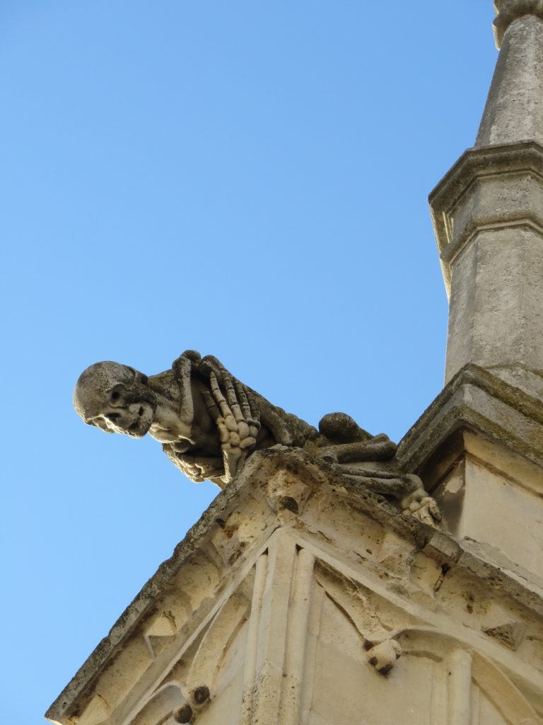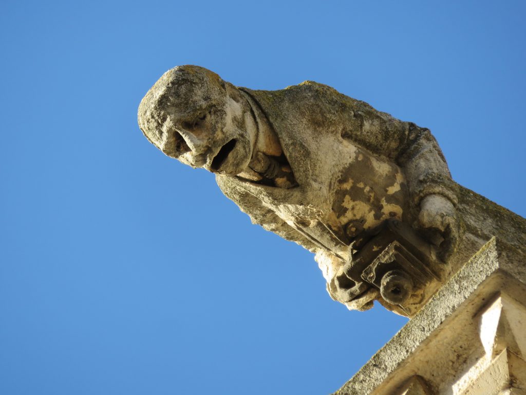 Continuamos con el juego de observación. La catedral ya había sido restaurada a principios del S. XX, ocupándose de la misma el arquitecto Jerónimo Arroyo. Entre las cosas encomendadas figuraba sustituir una de las gárgolas que se había desprendido y el arquitecto tuvo la feliz idea de esculpir a un señor vestido de levita portando una cámara de fotos «de las de fuelle», es un homenaje a su amigo José Sanabria, conocido fotógrafo de principios del siglo XX. A partir de entonces en la catedral comparten lugar las gárgolas del siglo XIV (unicornios, esqueletos, leones alados…) con un fotógrafo del S. XX.