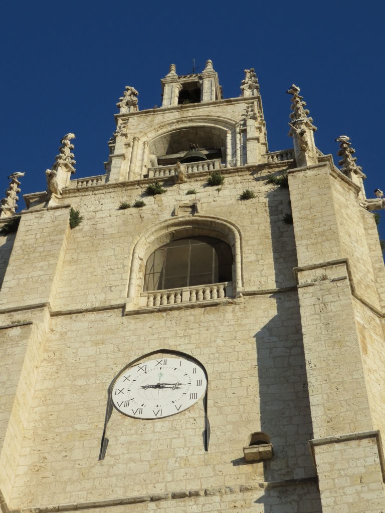 La torre impresiona como «tosca» para ser gótica y es que en realidad es una antigua torre defensiva. Hoy pasa los días convertida en «campanario» y hasta mediados del siglo pasado dio cobijo al campanero que tenía allí su vivienda. En la espadaña de la torre se sitúan dos campanas idénticas -una detrás de otra- la primera llamada Cimbalillos y la otra, de grandes proporciones, el Zarambombón del reloj que está ahí desde la época del emperador Carlos V.
